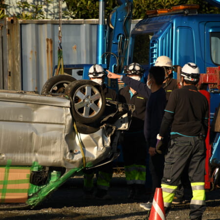 年に数回、計画的に実際に横転した車輌の起し方を実技講習を行い、新人がこれから現場で遭遇する練習から、ベテランが経験してきた場面を教える研修を行っております。教えることによって新たな発見でき、教える側も教えられる側も実になる研修が出来ます。